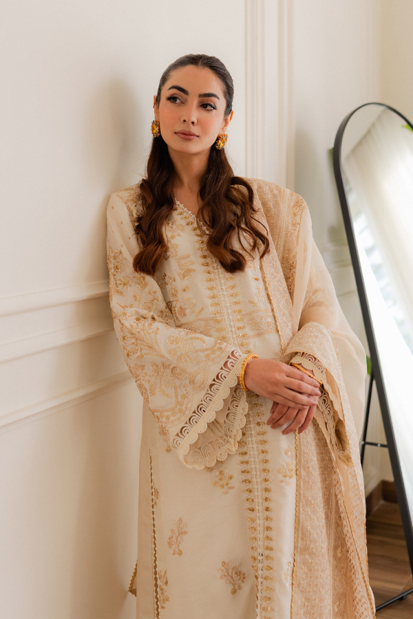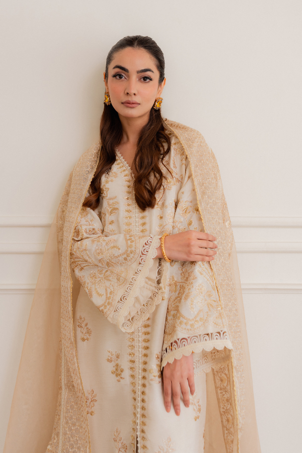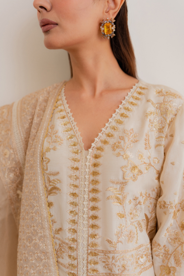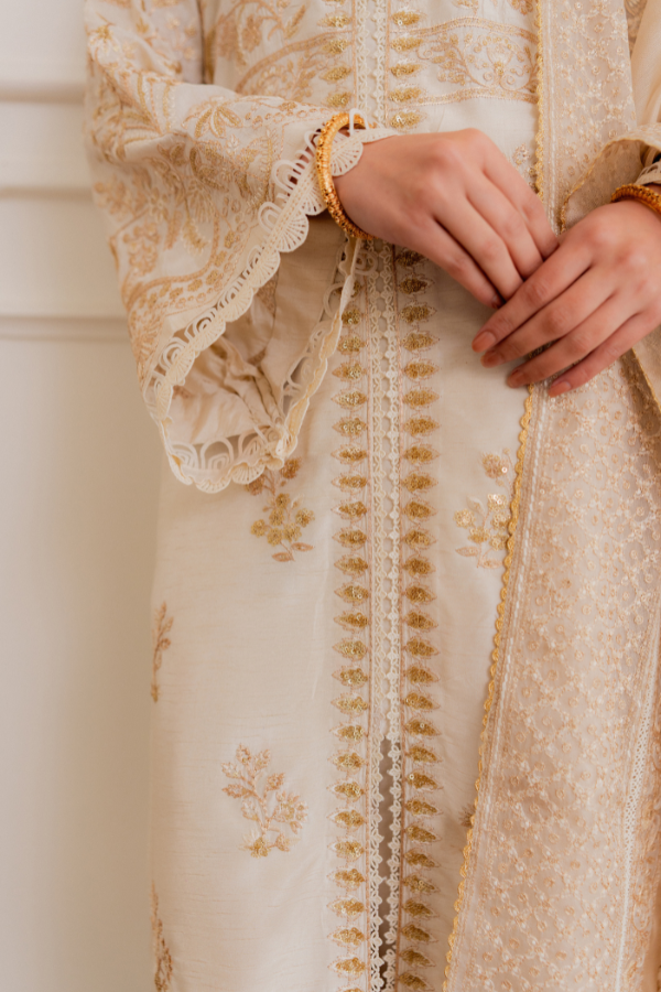 Work : Multi thread Embroidery with Gold Tilla and Sequins work This elegant ensemble is expertly crafted from premium Viscose Raw Silk, offering a rich texture and a sophisticated structured fall. The outfit is adorned with intricate multi-thread embroidery, beautifully accented by gold tilla and sequins work for a touch of timeless shimmer. To complete the look, it features a pure organza dupatta finished with all-around lace, adding a delicate and airy balance to the luxurious aesthetic.