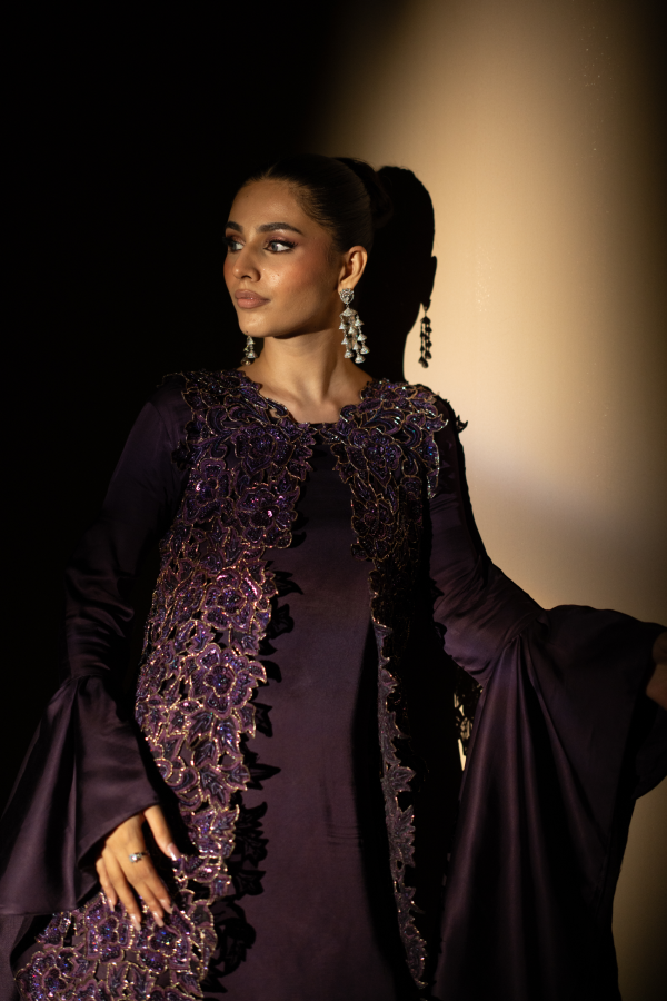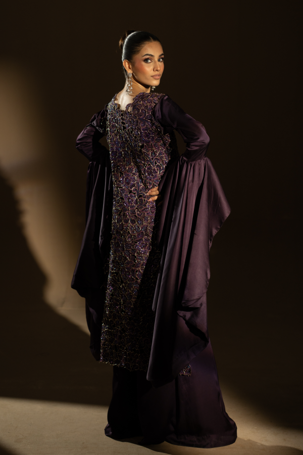 Grace meets grandeur in this mauve viscose shamoos ensemble, featuring exquisite gold tilla embellishments and detailed cutwork, an impeccable choice for elevating your festive and formal moments.