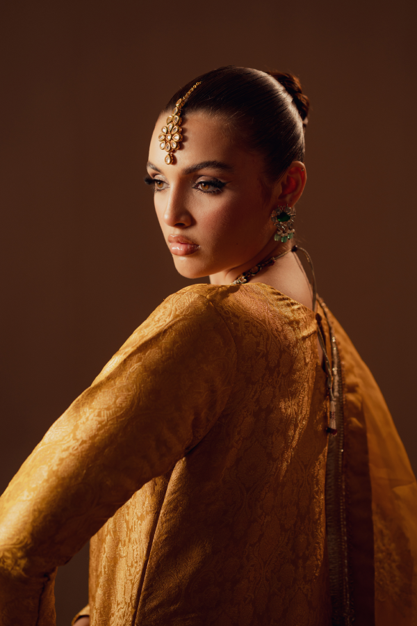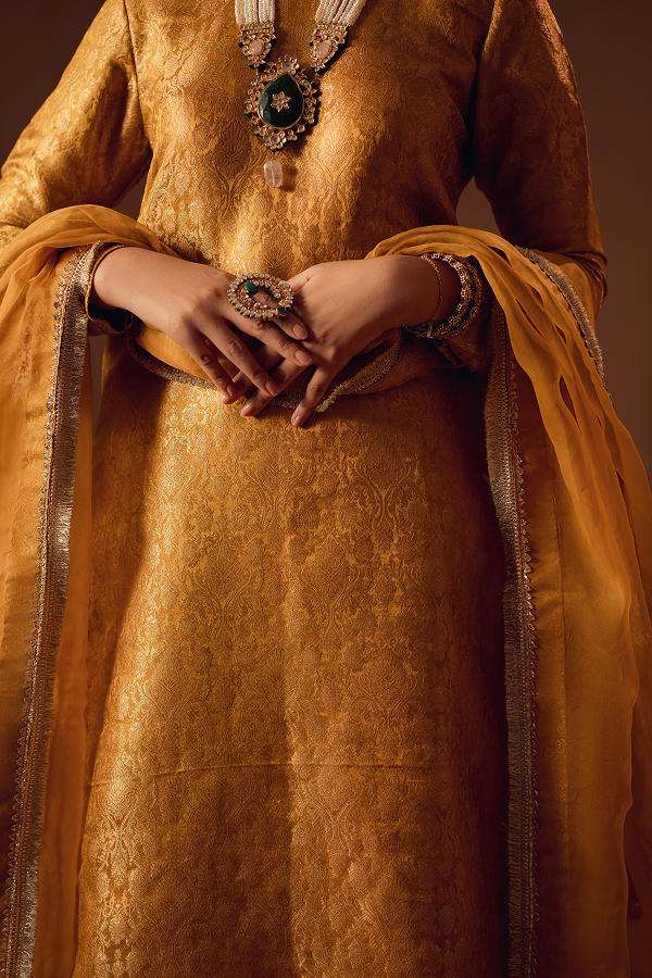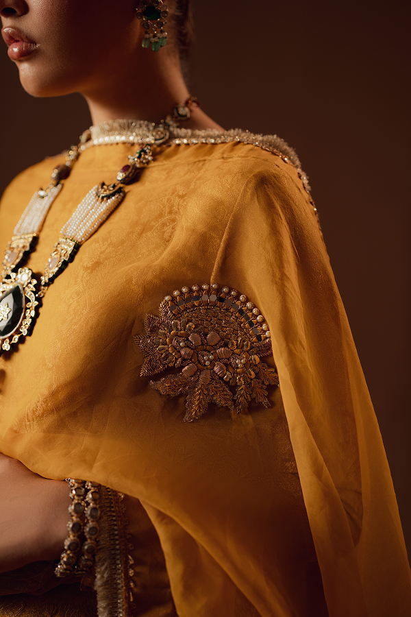 Wrap yourself in opulence with this lustrous mustard gold ensemble’, crafted from richly textured luxury fabric. The silhouette exudes grace, blending royal charm with modern sophistication.