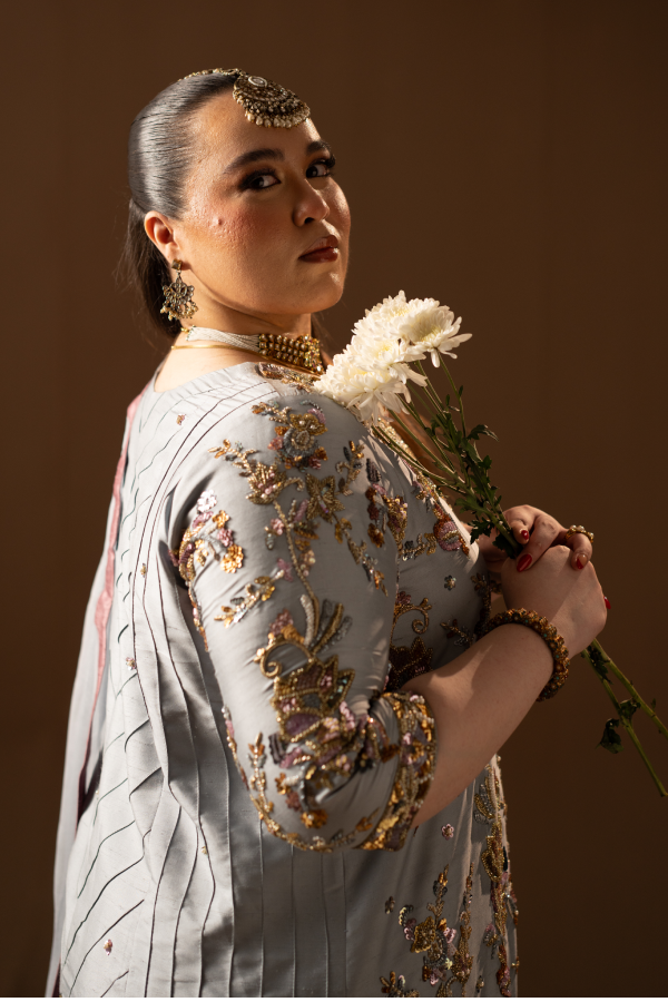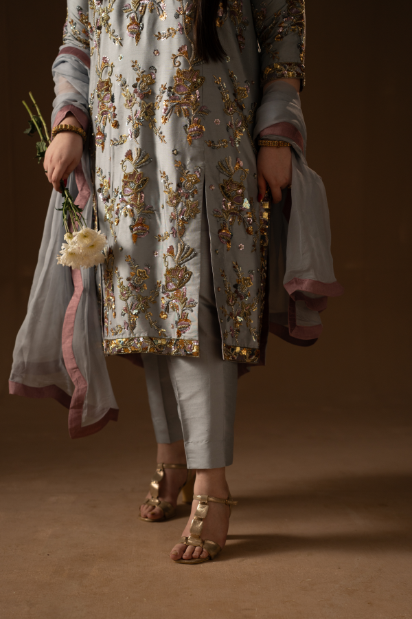 Step into understated glamour with this silver-grey raw silk shirt and trouser set, meticulously adorned with gold and multicolor bead tilla work detailing. The chiffon-organza dupatta adds a soft, graceful touch, creating a sublime choice for sophisticated soirées.