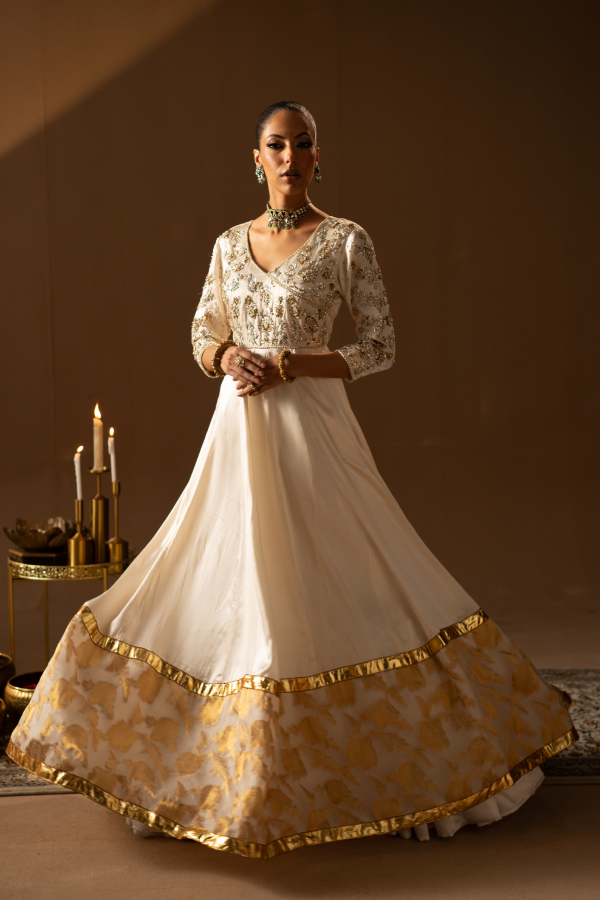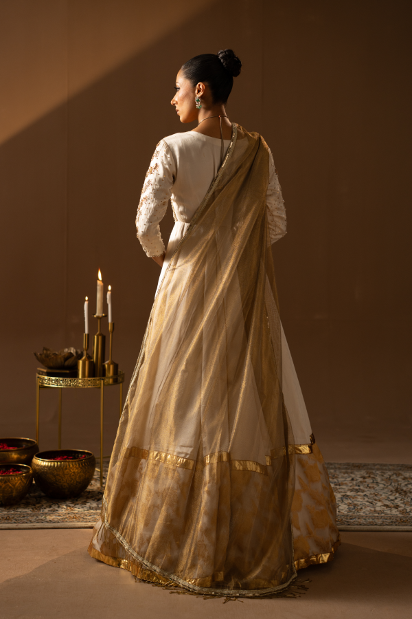 Embrace elegance with this Shamoos viscose formal dress in a graceful cream tone, featuring gold-embellished sleeves and an intricately embroidered angrakha-style neckline. Paired with a tissue gold dupatta, its flowing silhouette transitions perfectly from day to night occasions.