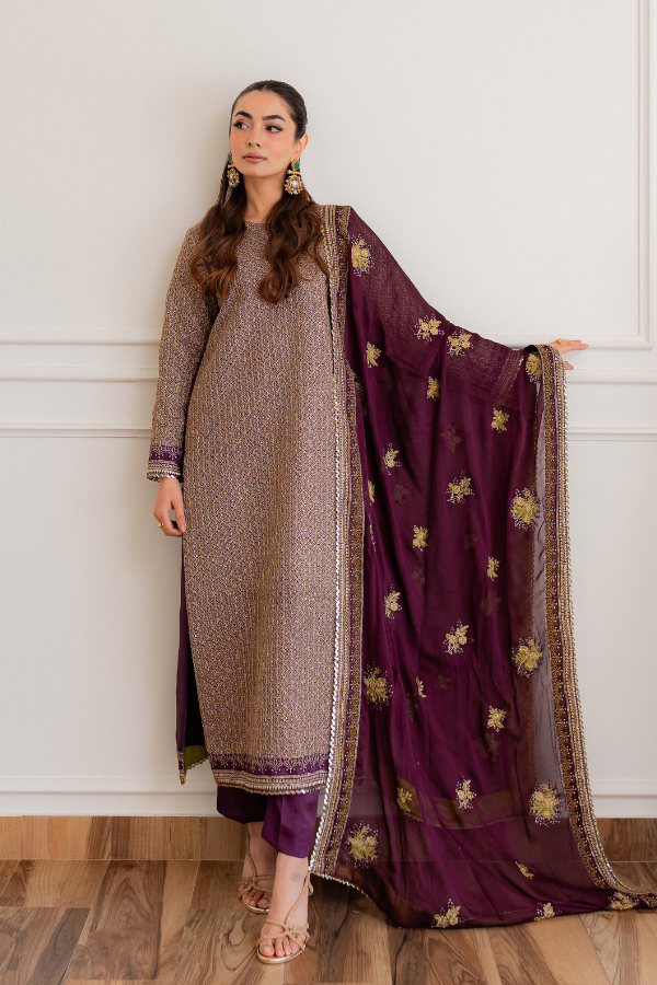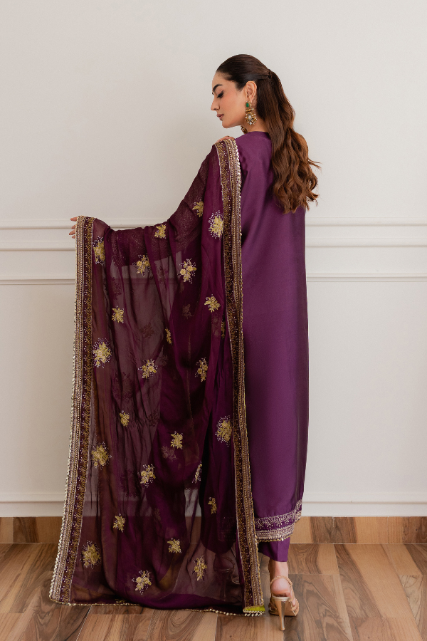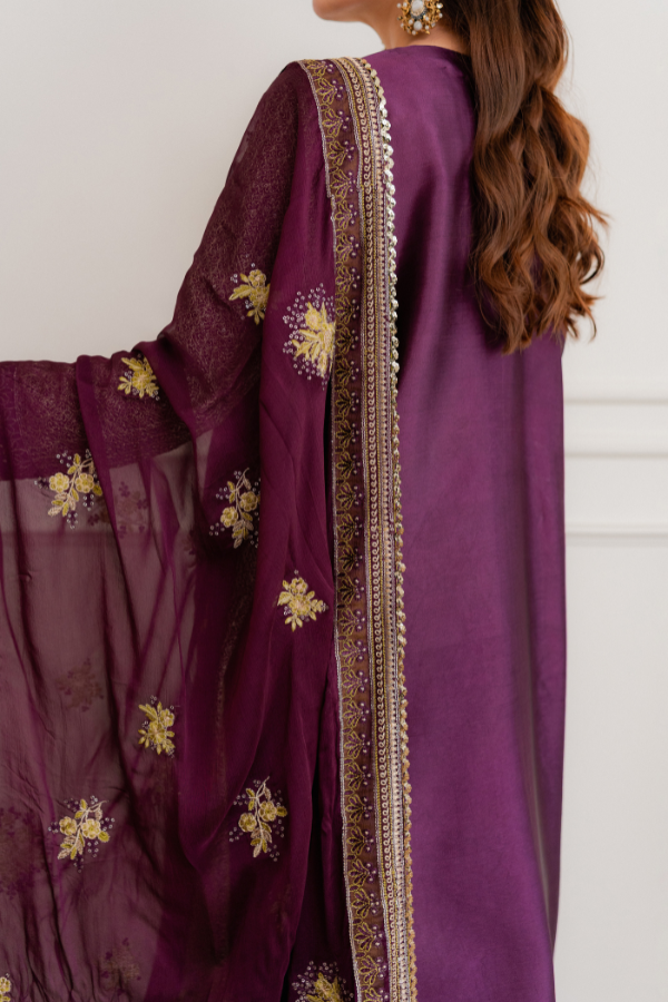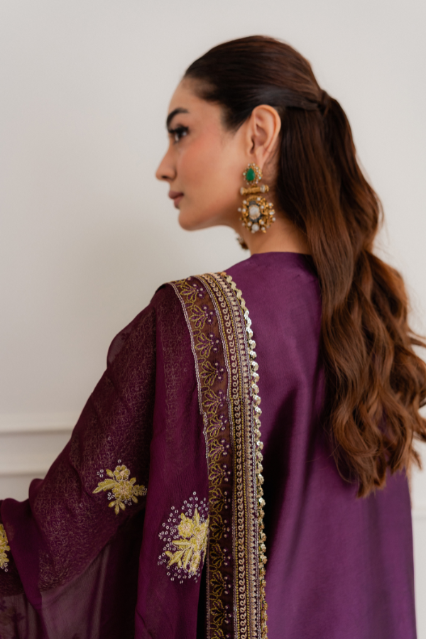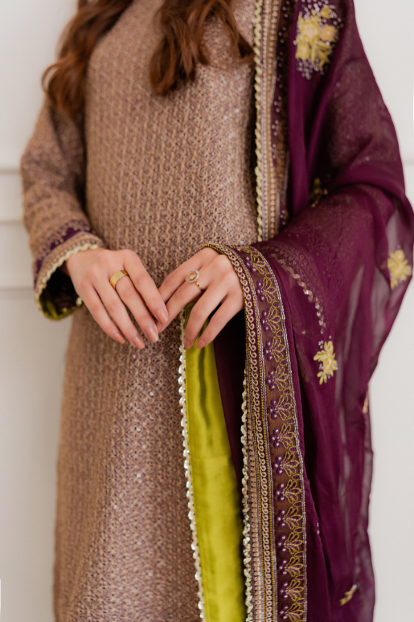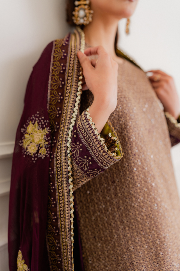 Dupatta: Bamber Chiffon Dupatta with all around Shamoz Silk Finishing and Gold Lace This ensemble is expertly crafted from Breathable Tassel Silk, offering a unique texture and a lightweight feel that ensures comfort without compromising on style. The design is enriched with intricate multi-thread work, complemented by the traditional shimmer of Tilla and sequins for a luminous, festive look. To complete the aesthetic, it is paired with a soft Bamber Chiffon dupatta, which features premium Shamoz Silk finishing and a delicate gold lace border for a refined and polished touch.