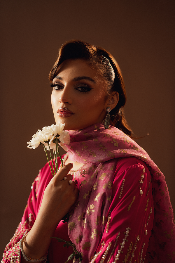 Style up this season with this modern ensemble, featuring an organza overlay, intricate embroidery, and subtle stone accents. The graceful drape and elegant sleeves bring semi-formal sophistication to life.