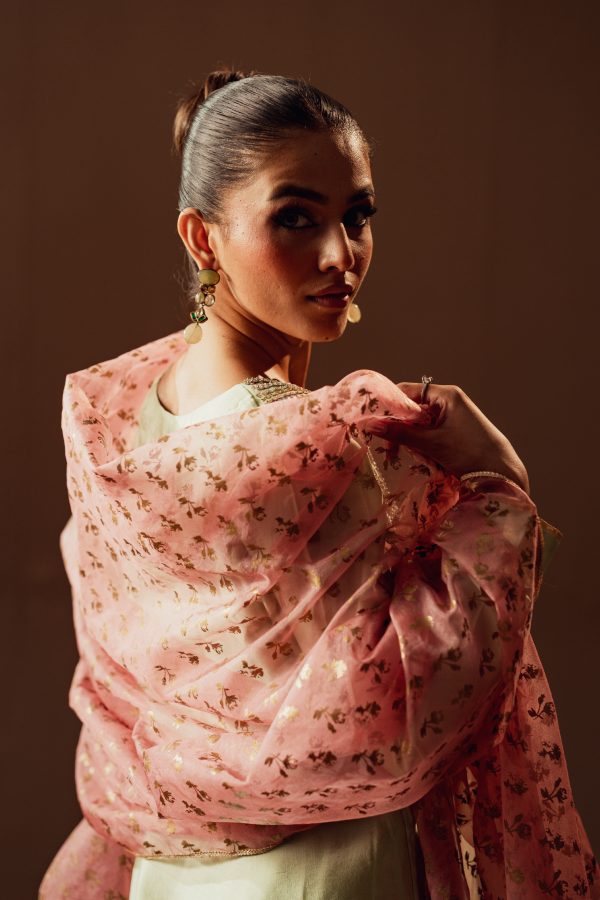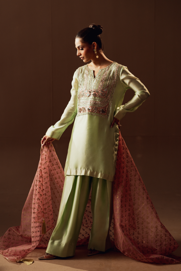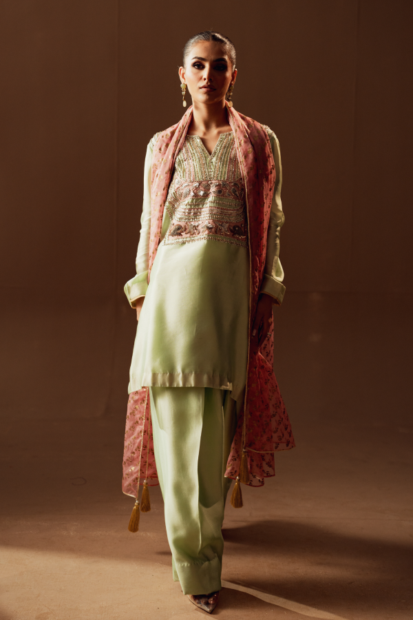 Celebrate in elegance with this elegant ensemble, designed on soft net featuring intricate embroidery and shimmering highlights. Its timeless cut with graceful sleeves strikes the balance between modesty and style. With a festive glow and sophisticated design, this dress becomes the perfect semi-formal statement for seasonal celebrations and graceful evenings.
