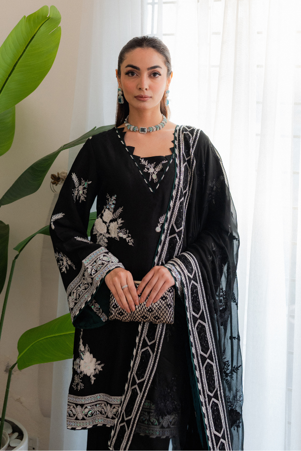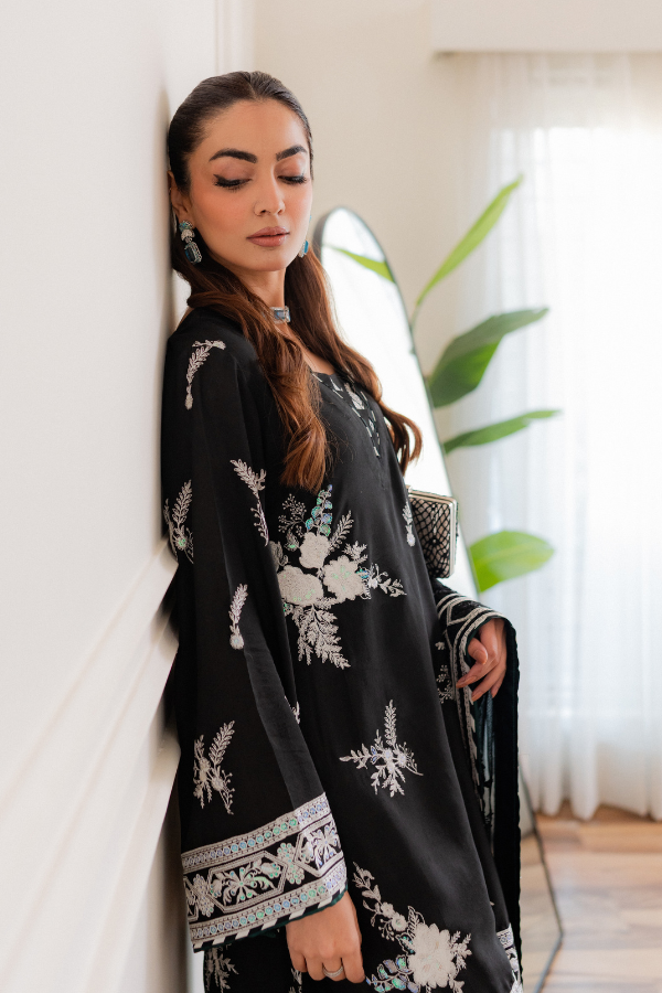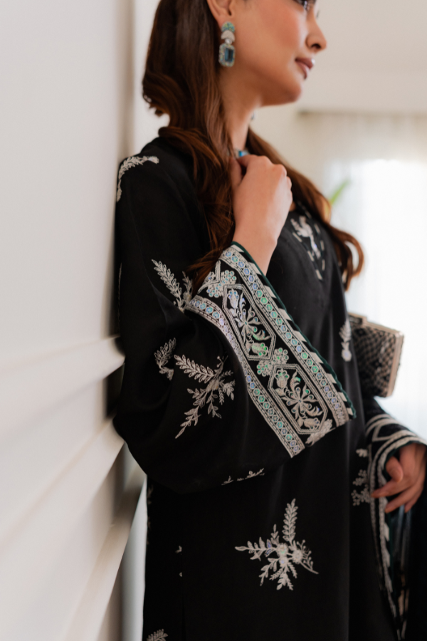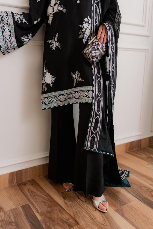 Dupatta: Bamber Chiffon with Shamoz Silk Finishing Crafted from premium Shamoz Silk, this ensemble offers a luxurious luster and an elegant drape. The outfit features intricate Raw Silk thread and sequins work, blending traditional textures with a subtle shimmer for a sophisticated finish. To complete the look, it is paired with a Bamber Chiffon dupatta, meticulously detailed with Shamoz Silk finishing for a polished and cohesive aesthetic.